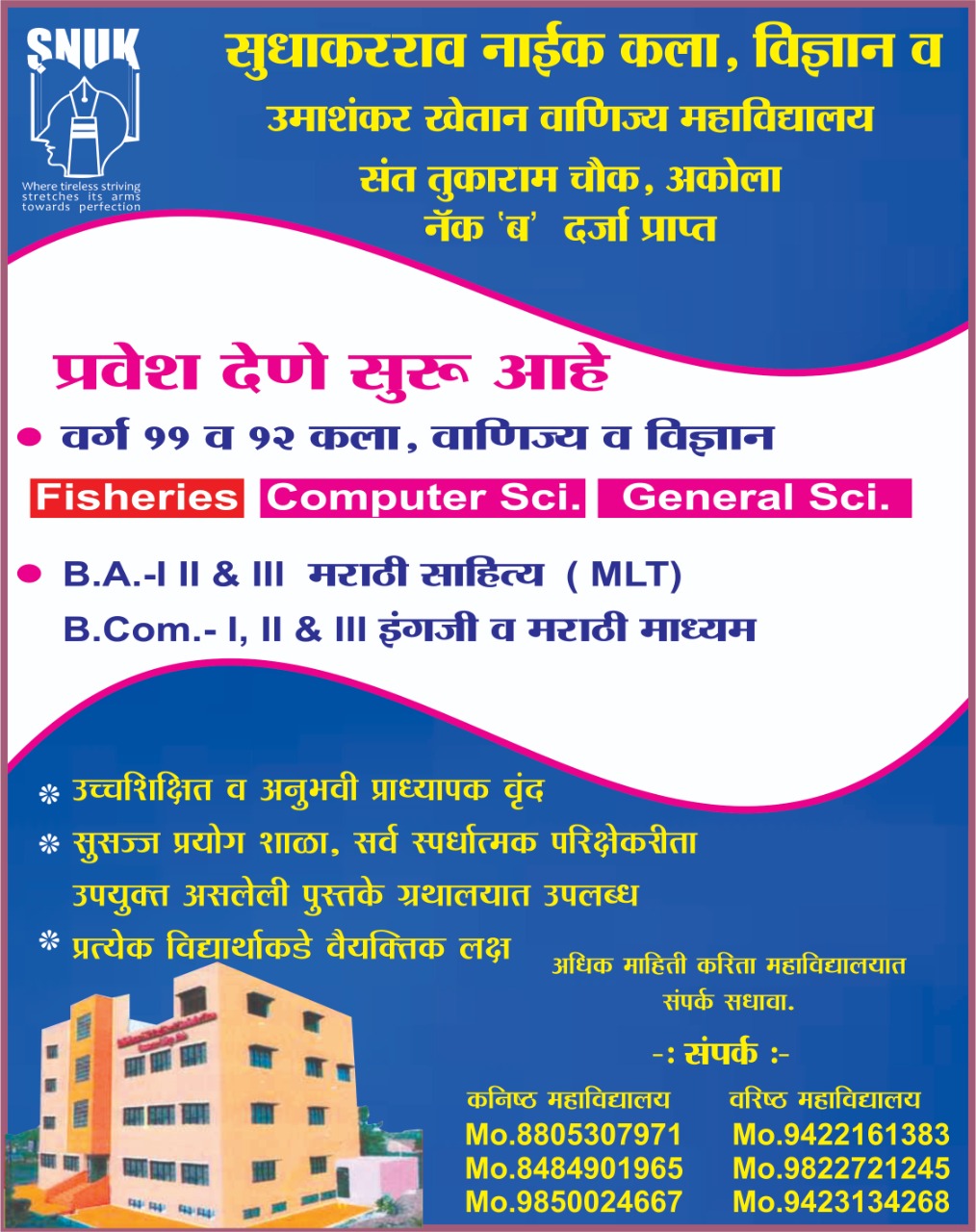 Shamki Mata Shikshan and Krida Prasarak Mandal Umari (BK) Dist. Washim is founded in 1980 with the aim to promote education for unprievilaged and Under previlaged sections of society. Sudhakarrao Naik Arts, Science & Umashankar Khetan Commerce Jr. College Akola is established in 1984-85 & Sudhakarrao Naik Arts and Umashankar Khetan Commerce Sr. College Akola is established in 1986-87. It is approved by Maharashtra Govt. and affiliated to Sant Gadge Baba Amravati Univeresity Amravati. Along with this College the following Institutions are run by the Sociery.